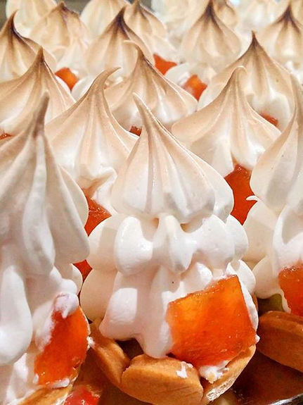 Hand made flower shaped shortbread tart shells, Filled with Organic hand made lemon curd & topped with a smooth Italian meringue. 2 sizes, 4cm $40, 8cm $75, minimum 12 pieces